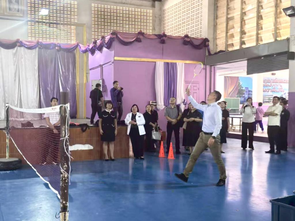 18日中午,代表团出席了在黎逸市金湖寺学校举行的羽毛球、乒乓球教学项目启动仪式。仪式规格高,黎逸市属所有中小学(含中职)校长、副校长悉数到场。黎逸市Nuchakorn Maschamadol副市长热情致辞,对我校代表团的到来表示热烈欢迎,并高度期待此行的教学项目惠及本地学子。黄昀副校长感谢黎逸市的周到安排,表达了推动合作务实深化、共建共赢的愿望。