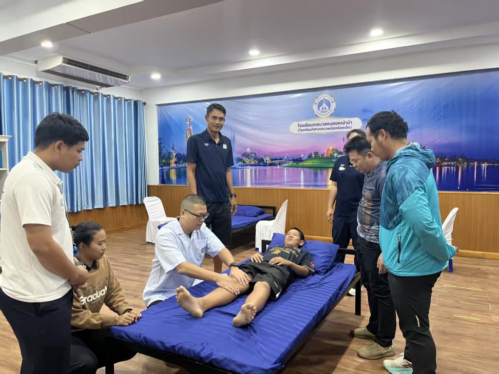 2025年4月,黎逸皇家大学校长、副校长等一行回访我校,专门参观“朱俊平中医大师工作室”和自治区示范性虚拟仿真实训基地运动健康实训基地等。泰方对学校将“现代手段发现问题,传统手段解决问题”深度结合的实践给予高度评价,并亲身体验中医保健疗效,进一步坚定了泰方与我校深入合作的信心。