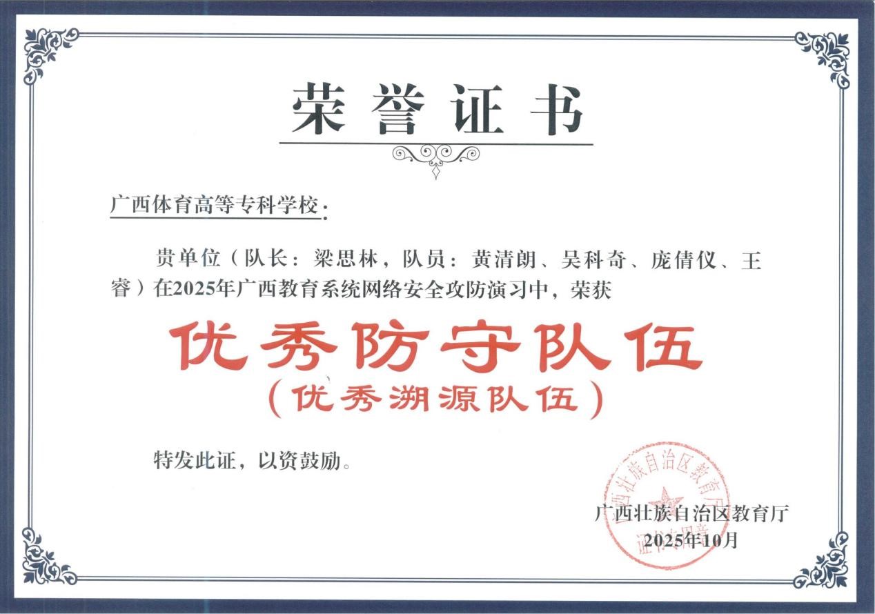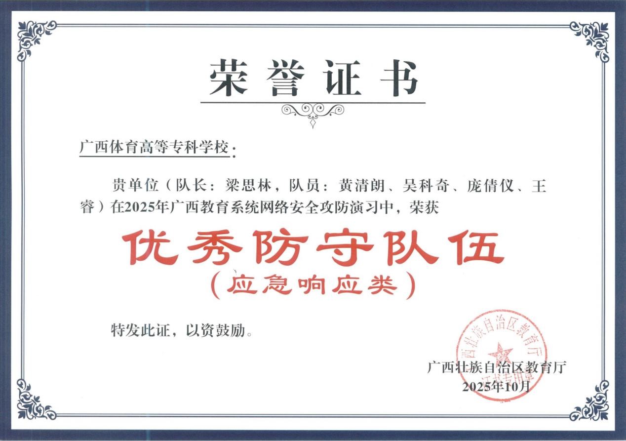 10月30日,2025年广西教育系统网络安全攻防演习总结会暨网络安全技术论坛在柳州召开。我校凭借出色的网络安全防护能力,连续三年荣获“广西教育系统网络安全攻防演习优秀防守队伍”称号,并同时斩获“应急响应类优秀防守单位”与“优秀溯源队伍”两项荣誉。