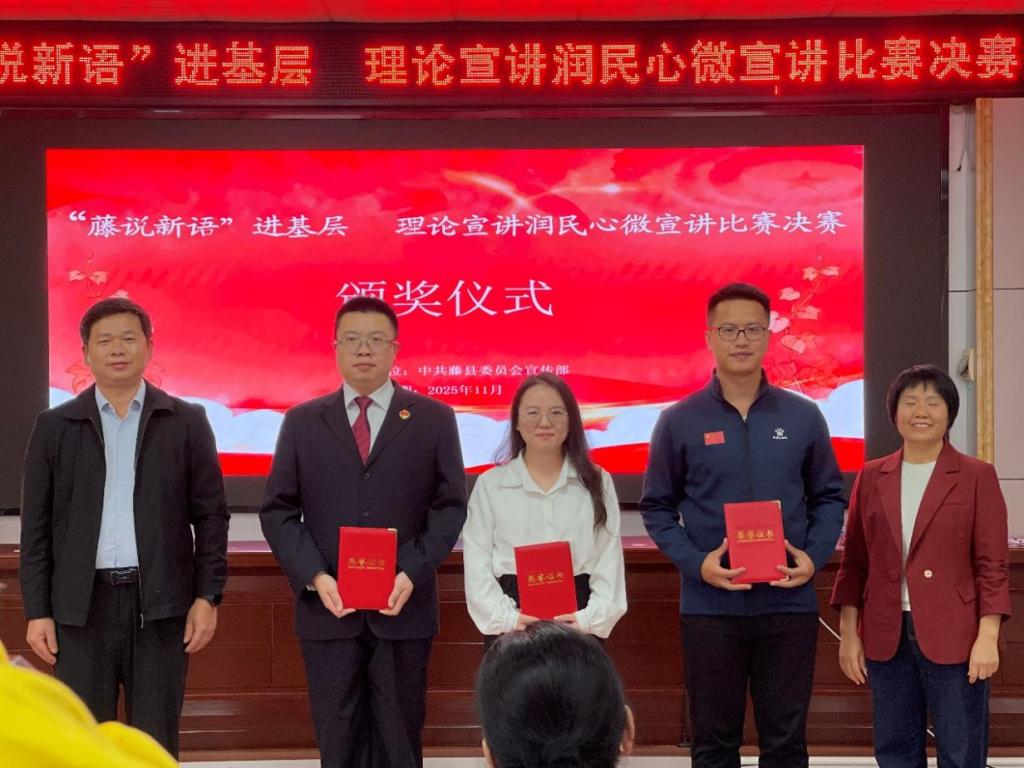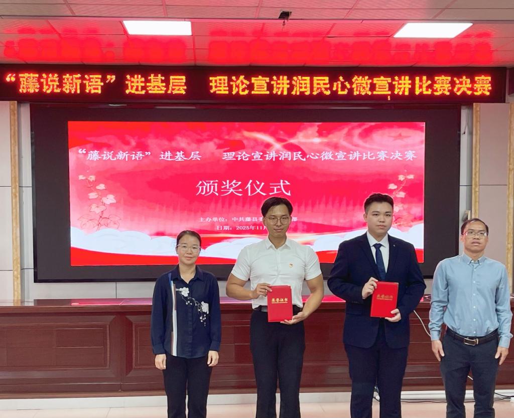 近日,在藤县党委宣传部主办的“藤说新语”进基层理论宣讲润民心微宣讲活动决赛中,我校派驻东荣镇坡头村第一书记郑子杰、杨垌村第一书记刘智炜,聚焦“体育+乡村振兴”主题,结合驻村实践分享深刻见解、讲述生动故事,凭借扎实的理论功底与鲜活的实践案例在赛场脱颖而出,分别荣获二等奖、三等奖,充分展现了我校驻村干部扎根基层、赋能振兴的专业素养与精神风貌。