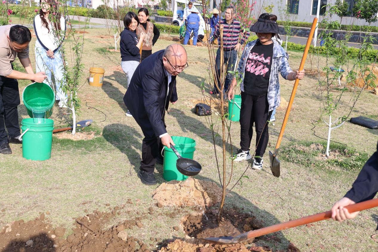 植树现场,大家热情饱满、分工协作、秩序井然。挥锹铲土、扶苗扶正、填土压实、浇水涵养,各个环节衔接有序。师生们共同栽植桃树,以实际行动为校园播撒新绿,让育人愿景与苗木一同茁壮成长。
